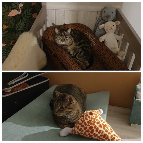 Met de katten heb ik geen probleem. Die hangen zoiezo meer aan mn man dan aan mij. 😀 De hond daarin tegen, die doet echt vreemd. Ik had deze week 10u onregelmatige weeën. De hond is gans de tijd naast me blijven zitten. Hij heeft bijna niet geslapen. Zelf toen mijn echtgenoot hem vroeg om aan de kant te gaan. (Wat hij normaal dan flink doet) bleef hij halsstarrig zitten. 😄