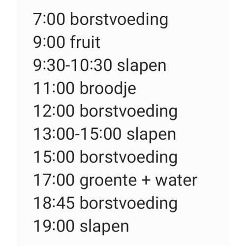 Sorry, mijn antwoord is misschien een beetje kort door de bocht. Ik gebruik zelf ook het 234 ritme als leidraad, maar heb dit wel aangepast naar wat werkt voor mijn zoontje. Ik hoef hem bijvoorbeeld echt niet in de ochtend na 2 uur al in bed te leggen en de middag 3 uur haalt hij niet. Wij hebben nu dus 2,5-2,5-4 ritme. Ik heb een foto bijgevoegd van ons ritme, met als kanttekening dat dit kan afwijken als ik merk dat mijn zoontje hier behoefte aan heeft.