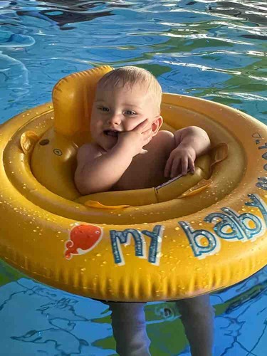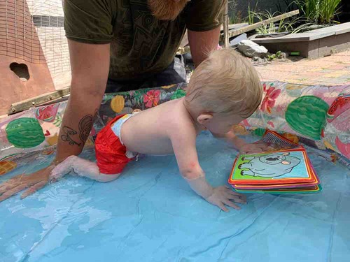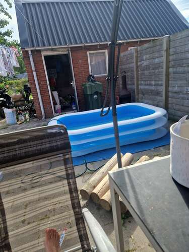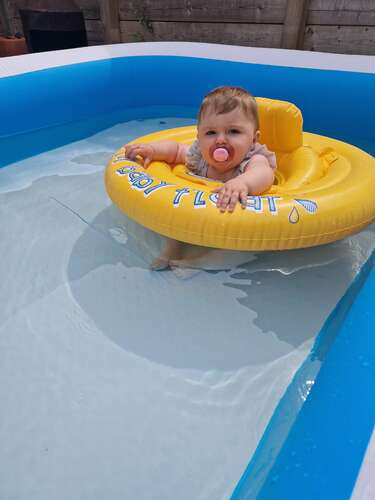 Ja hoor, badje is aan het vullen. Straks even aantal emmers heet water erbij, zon z'n werk laten doen en dan lekken in de baby float erin. Dochter is 10 maanden