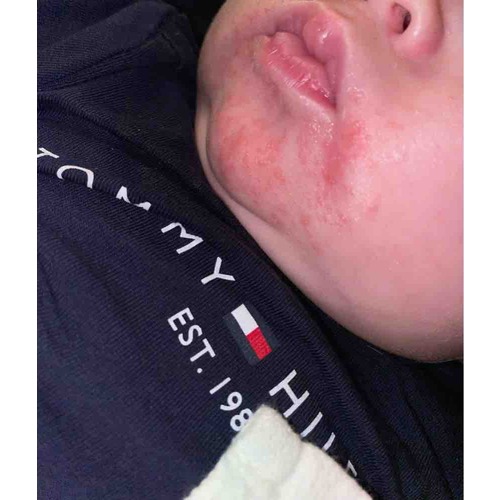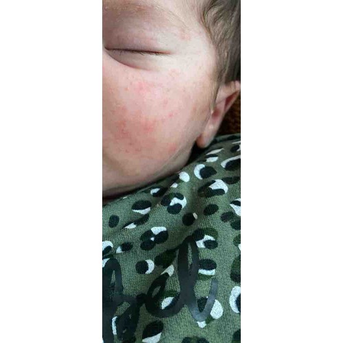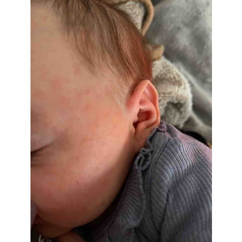 … Ik heb niet het idee dat ze er last van heeft. Ik gebruik ook geen olie of lotions. Was haar gezichtje alleen met water. Het zit op haar gezichtje maar ook op haar oortje en door haar haartjes heen zie ik het ook op haar hoofd huid. Verder nergens. Ik heb ook geen idee wat het is