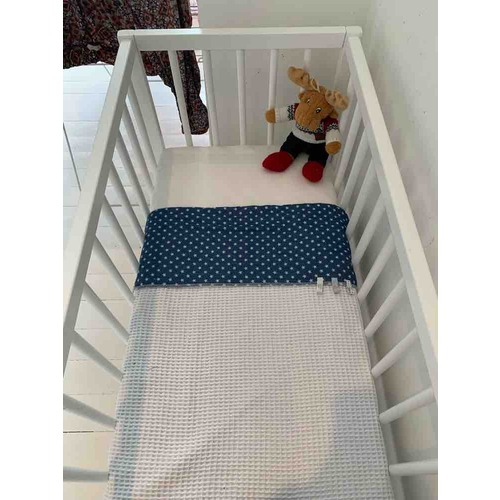 Overigens, aangezien je een groot een kleine bedje ga gebruiken, kan je natuurlijk altijd een deken of laken van het andere bed gebruiken als het echt nodig is.