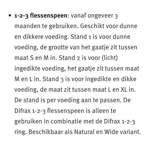 Wij hebben van difrax alle spenen uiteindelijk gekocht omdat we hetzelfde probleem hadden. Nu met 2 schepjes rijstebloem en de 1-2-3 speen op stand 3 kan hij de fles rustig leegdrinken (wel langzamer dan een gewone melkfles). De L speen was hier ook veel te groot en de M te klein..