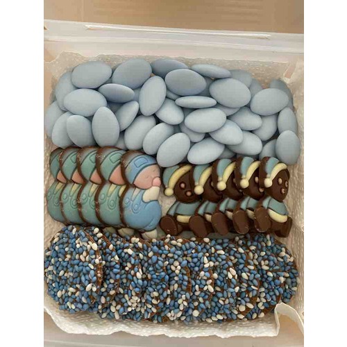Na de bevalling wil ik graag een sweettable in de woonkamer neerzetten voor het kraambezoek. Ik ben opzoek naar blauwe snoepjes/chocolaatjes die ik in een winkel kan kopen (mag trouwens ook wit zijn).