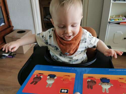 Mijn zoontje van 8,5 maand vindt boeken met geluid ook heel leuk. Hij wil dan op de knopjes drukken, terwijl ik lees.