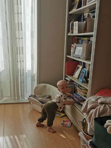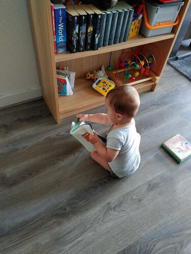 Mijn zoontje heeft ook totaal geen gedult voor voorlezen, wil allern maar op het boek kauwen of weg smijten. We hebben nu de onderste plank van de boekenkast zijn plank gemaakt. En soms pakt hij daar zijn boekjes uit om mee te spelen. Net trof ik hem zo aan🥰 Op deze manier speelt hij toch met boekjes, maar op zijn eigen manier