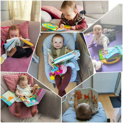 Ik gebruik verschillende soorten boekjes. De boekjes met stevige kartonnen bladzijden mag ze zelf vasthouden. Ik heb haar meestal op schoot tijdens lezen, maar ik geef ook vaak een boek om me te spelen. Ik heb stoffen sensorische boekjes, kartonnen boekjes, boekjes met flapjes of stoffen vingerhoed dieren erin en normale voorleesboeken. Veel met je stem spelen en reageren op de plaatjes die ze aanwijst houdt het interessant.