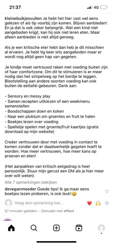 Solid starts op instagram heeft heel veel tips om het eten gezellig te houden. Verder helpt het hier om hem mee te laten helpen met koken. Ik laat hem bijv. groenten in de pan gooien, eitje klutsen, uitzoeken welke pasta (penne, macaroni etc) en vaak eet hij dan ook tijdens het koken van alles al een hapje.