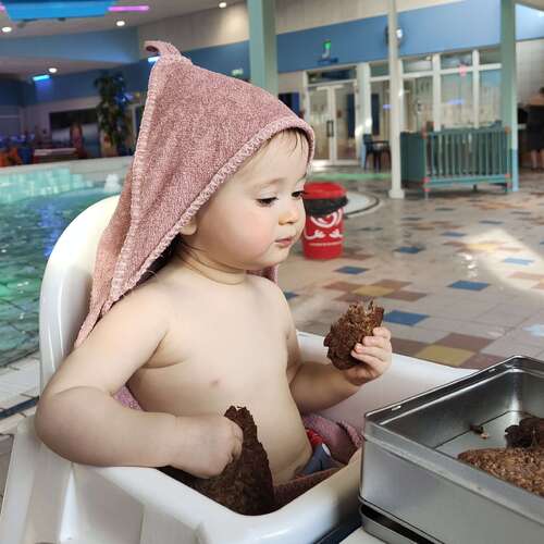 - lunch is vaak een hartige muffin, bananenpannenkoek of roerei met brood, vandaag heeft ze vier bananenpannenkoekjes (1 soepelbeslag groot per pannenkoek) op gegeten.