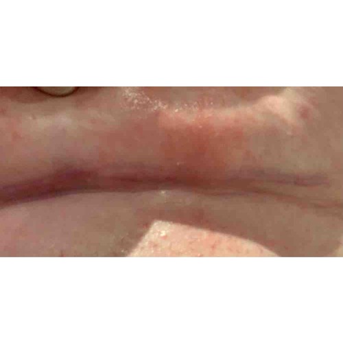 Ik vind de foto lastig te beoordelen. Aan de zijkant ziet het litteken er mooi uit - dat het nog wat rood is, is niet erg. In het midden heb ik het idee dat de huid boven het litteken wat ge茂rriteerd is.