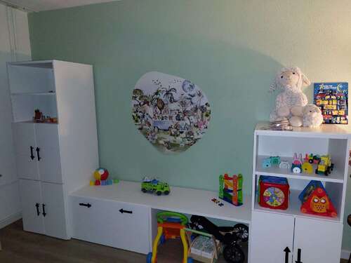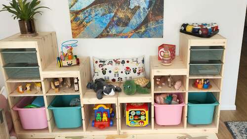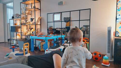 Wij hebben 2 open kasten, deze onderin zo gemaakt waar hij bij mag en kan. Ook er naast staat een tafel en 2 auto's en loopwagentje, hij heeft meer dan voldoende speelgoed en mag door het hele huis spelen, vaak zit hij dichtbij de kast waar al het speelgoed is. (Mijn partner en kleine staan ook op de foto spelend)