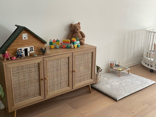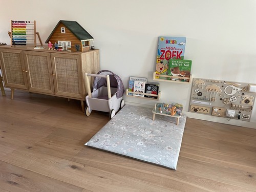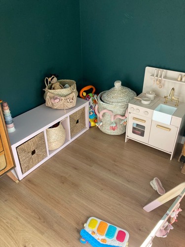 Ik heb vandaag de box weggehaald. Ze heeft daar in die hoek nu een lichtroze keukentje van petite Amélie en daarbij staat dan nog een kallax drie vakken kast vd ikea (liggend op de grond zodat zij staand er aan kan spelen). Die heb ik dezelfde kleur geverfd als het keukentje. In de vakken opbergmanden en voor de grotere dingen heb ik nog een grote mand van zeegras erbij staan. Overdag een teringzooi want favoriete bezigheid is alles uit de manden te gooien. Zodra zij naar bed is gooi ik alles terug erin.