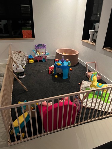 Wij hebben naast haar box een speelplekje. Als we de box weg doen dan maken we een groter plekje voor der. Op de foampuzzel stond eerst haar wipstoel waar ze op klom dus uit nood hebben we dat eronder gelegd, ze vind het heerlijk om daarop te spelen en haar speelgoed en loopkar staat daar ook op. We hebben het niet afgesloten maar als we even iets moeten doen dan kunnen we haar altijd in de box zetten.