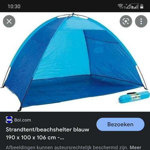 We hebben een uv parasol met flapjes. Dan kan je er een tent van maken als je hem schuin in de grond steekt (ook handig in de tuin). Flapjes omhoog en in standaard en het is een gewone parasol.