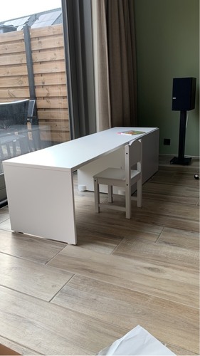 Wij hebben de afgelopen weken onze woonkamer en keuken aangepakt en hebben nu ook een speelhoekje voor ons zoontje gemaakt. Op de wand zit gedeeltelijk een kurkwand, hier kunnen we tekeningen op prikken. De houtkleurige tafel en bakken zijn op maat gemaakt, de stoeltjes kwamen van marktplaats en heb ikzelf geschilderd. De ladekast is gekocht en is veel te vinden op internet. Wat we vooral belangrijk vonden is dat het echt een knus plekje werd om lekker te spelen, maar ook veel bergruimte en het moest ook een beetje matchen met de rest van het interieur. Wij zijn zelf heel tevreden met het resultaat!