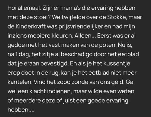 Ik heb inmiddels de stoel om kunnen ruilen en ben voor een Stokke gegaan. Volgens de verkoopster horen de klachten die we hadden niet al zo snel te ontstaan. Maar is het bij veelvuldig gebruik wel zo dat er sneller beschadigingen kunnen ontstaan.