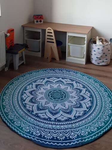 Wij hebben verschillende speelplekken. Op zolder als ik de was doe dan ligt mijn zoontje op een gym/yoga matje en een los speeltje. In de woonkamer hebben we foamtegels liggen en op zijn kamer ligt het kleed van de foto (zelf gemaakt van een strandhanddoek en oud dekbed als vulling)