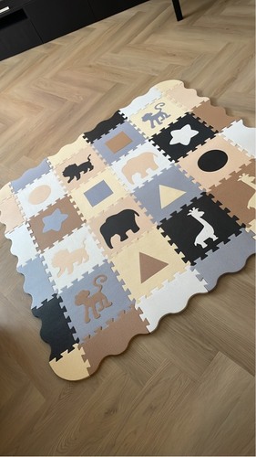 Wij hadden eerst een boxkleed, alleen het boxkleed is te zacht om op om te rollen. Dus inmiddels hebben we foam ‘tegels’ en dan in zachte kleuren zodat het mooi bij het interieur past hihi. De figuurtjes kunnen er uit gehaald worden!