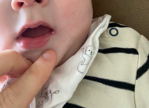 Had mijn dochter toevallig ook paar weken geleden! Was bij de huisarts voor iets anders dus meteen even naar laten kijken. Ben de medische term vergeten maar het is een schimmeltje maar gaat vanzelf weer over. Proberen de mond goed droog te houden en evt zinkzalf smeren zei de arts. Het wordt veroorzaakt als de huid daar veel nat is, door kwijlen bijvoorbeeld