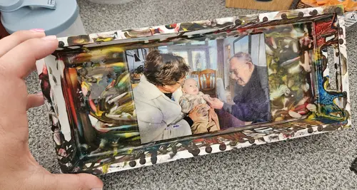 Ik heb toen een dienblad laten verven door mijn zoontje en daarna eer foto erop geplakt van hem met mijn opa en oma (we gingen toen naar hun toe op vakantie) en dit afgesloten met een beetje epoxy.
