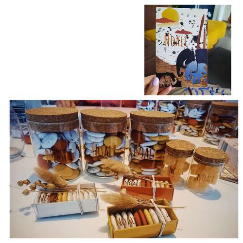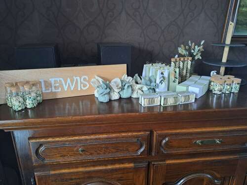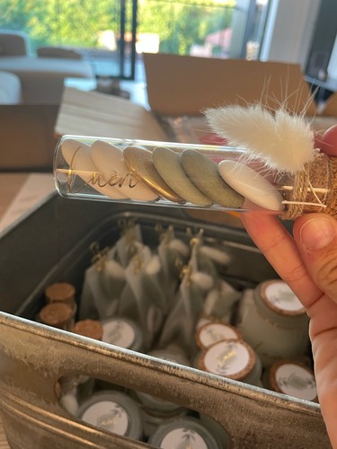 Hier onze suikerboontjes, ik ga alles nog afwerken met naamstickertjes of labeltjes weet ik nog niet zo goed en een droogbloemetje eraan hangen😅