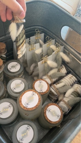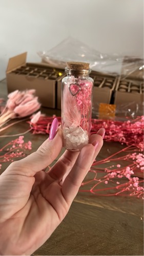 Ik heb glazen reageerbuisjes met kurk gevuld met rozenkwarts en wat droogbloemen. En nog een babyflesje waar wit/roze hartjes snoepjes inkomen.