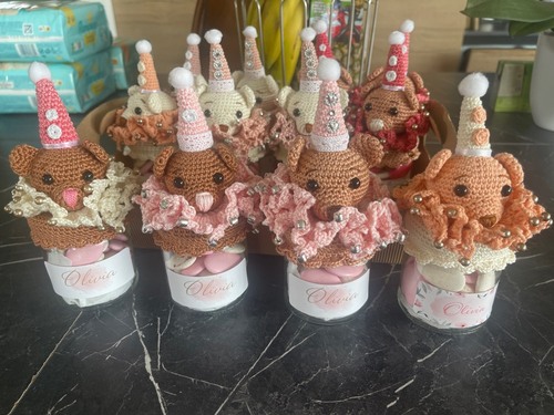 Hier ook een trotse Belg 🤭😅 wij hebben geprobeerd origineel te zijn en mijn oma is beginnen haken vanaf wanneer ze wist dat het een meisje was 🙈 ondertussen is alles af en hebben we meer als 60 potjes met beertje op ook hebben we 30 tal zakjes van tetra doeken en droogbloemen er aan omdat de potjes enkel voor familie is en voor de kindjes hebben we kleine gehaakte knuffelbeertjes van het zelfde als de potjes, enkel dan met snoepjes aan