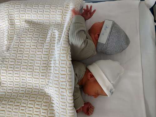 Links Kaj(2.1kg) en rechts Noah(2.3kg) geboren met nu bevestigd bijna 35 weken(verloskundige had op de 12 weken een weekje te vroeg geschat) vanmkrgen 3 september rond half 6 geboren dmv een spoedkeizersnede na spontaan gebroken vliezen afgelopen nacht.
