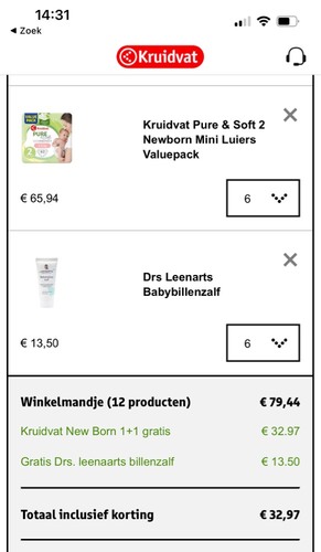 Heb net bij de kruidvat besteld 1 plus 1 gratis op de new born luiers plus een gratis zalf van dr leenarts. Echt een super actie.