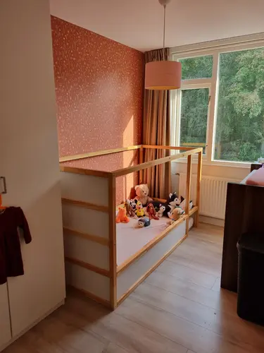 Hier is de kamer van de jongste nog niet heel erg veranderd. Ze heeft al een tijdje een eenpersoons vloerbed (Kura van Ikea). En ze had altijd al een grote kledingkast staan, die gewoon haar hele jeugd mee kan 😜. Ook het behang is nog leuk voor de komende jaren. Alleen staat de commode er nog, die willen we binnenkort gaan vervangen door een ander leuk lastje voor speelgoed, knuffels en boekjes etc. Tips voor leuke kastjes zijn welkom 😊.