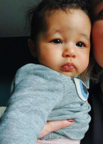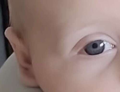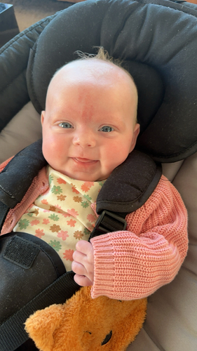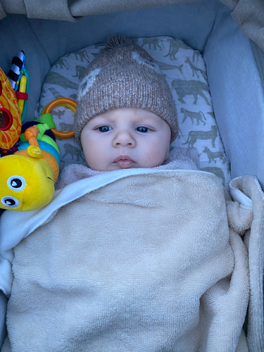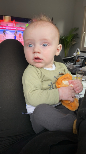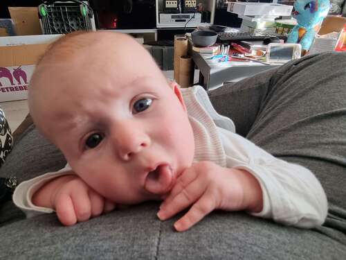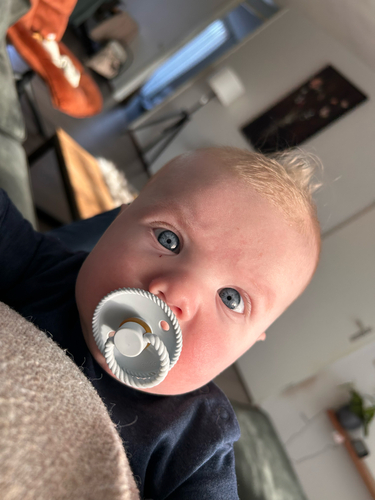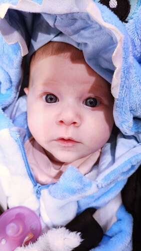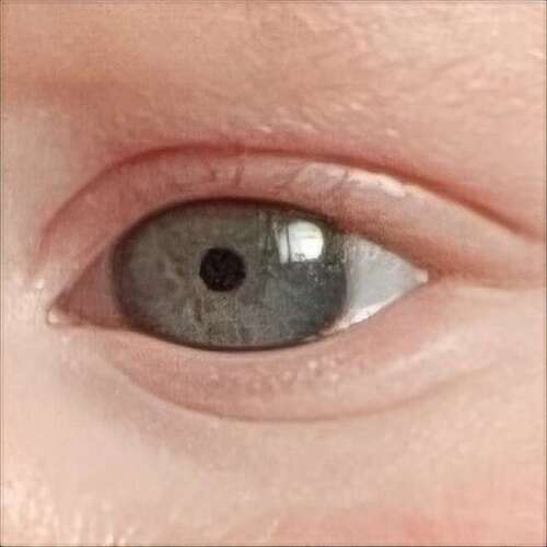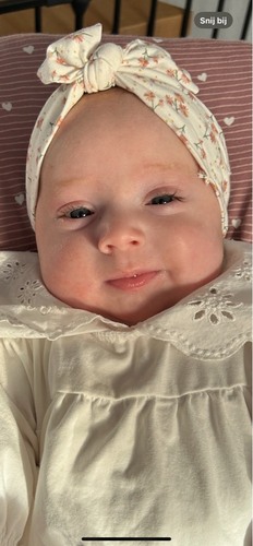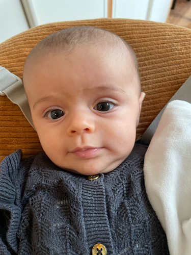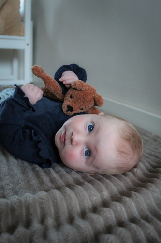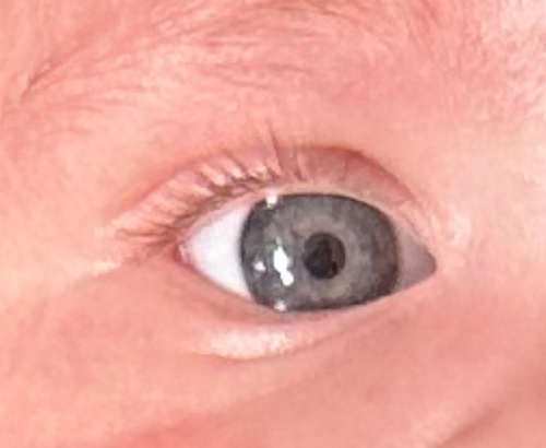 Hier nog een een grote twijfel tussen donkerblauw/grijs/bruin. Bij haar grote broer was na 3 maanden al duidelijk dat hij helder blauwe ogen had.