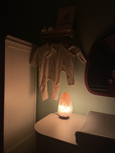 Wij hebben een gewone lamp maar daar zo’n Ikea lampje ingedraaid. Kun je via je telefoon bedienen; op de kleur rood zetten en flink dimmen. Ideaal!
