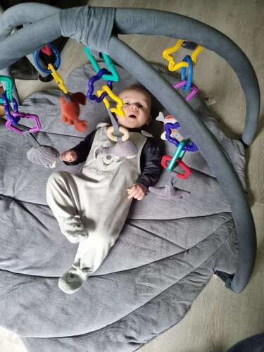 Bij opa en oma ligt er een speelkleed met wat fellere kleuren en een spiegeltje eraan. Die valt ook goed in de smaak. Ik weet alleen niet van welk merk dat kleed is.