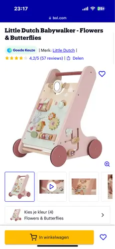 Little Dutch blokkenkar. En voor buiten een Woezel en Pip loopwagen. We hebben ook nog een houten poppenwagen, maar die kiept als ze gaan oefenen met net lopen.
