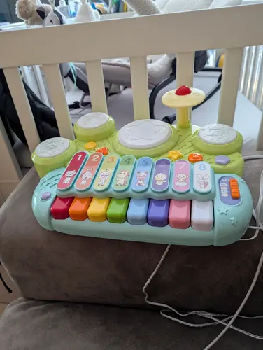 Gekleurde houten blokjes, stapelvormpjes van silicone, een rammelaarauto met wielen (op de opvang is een houten autootje favoriet), sophie de giraffe, knisperboekjes, bijtspeelgoed.. wat niet eigenlijk? Hij speelt echt al heel leuk en heeft duidelijk favorieten, zo grappig. Hij is ruim 6 maanden.