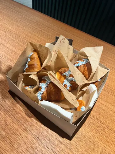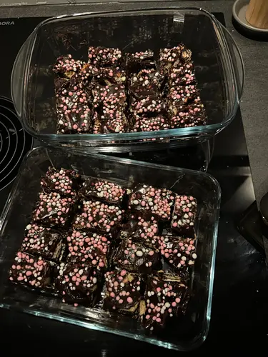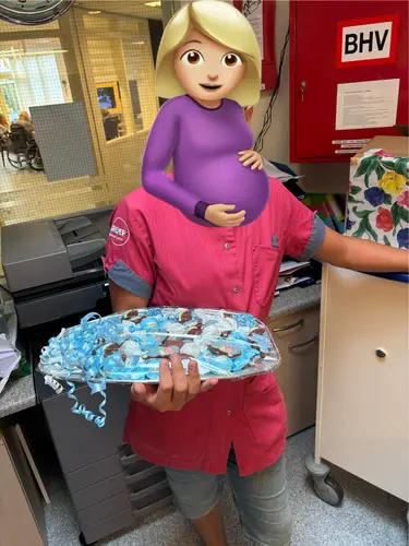 Ik houd van bakken, dus ik ben gewoon voor iets gegaan waarvan ik dacht dat vinden mijn collega’s wel lekker ;) zijn uiteindelijk blondies en brownie/cheesecake met frambozen geworden. De blauwe muisjes trakteer ik wel als ik de baby kom showen ;)
