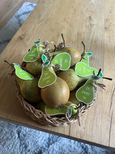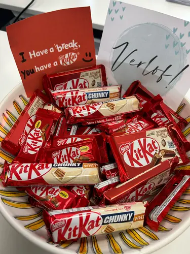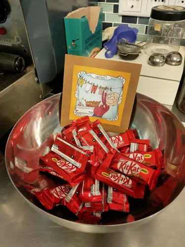 Ik denk er aan nog een pot te brengen met toffees, kitkats en mini tonys. Dan een kaartje er bij met iets van;
