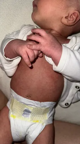 Dit soort uitslag na de fles , benauwd na de fles, onrustig met armen en benen na de fles en ik kon hem amper wegleggen daarna hij wilde alleen maar op mij liggen