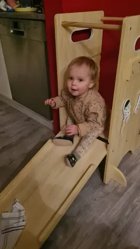 Bij ons is het ook een groot succes, al vanaf zijn verjaardag. Hij wil zo graag meekijken, dit is echt de uitkomst. Hij klimt er heel makkelijk zelf op en af. Ook nog eens om te vormen tot tafeltje of klimrek met glijbaan. Dik tevreden en het geld 100% waard wat ons betreft.
