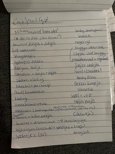 Mijn baby is 5 maanden en ik ben al 2x met hem bij mijn oma in Spanje geweest. Eerste keer hadden we veel te veel mee, want we konden daar gewoon wassen. Wat wel heel fijn was, was dat ik 2 schone outfits bij me had in de handbagage het vliegtuig. Door de druk heeft namelijk elke keer zowel bij het opstijgen als landen een spuitluier gehad 😂. Zorg dus ook zeker voor zakjes voor de vieze kleren in je handbagage. We hebben bij mijn oma meteen op de eerste dag een campingbedje gekocht bij de Carrefour. Voor €40 ben je klaar en wij zijn van plan toch regelmatig naar mijn oma te gaan dus voor ons een logische investering. Onze baby kan slecht tegen fel licht dus de tweede keer had ik dit mee: https://www.bol.com/nl/nl/p/dooky-universal-cover-zonnescherm-kinderwagen-romantic-leaves-beige/9300000137312009/?Referrer=ADVNLGOO002031-S--9300000137312009-PMAX-C-22278327527&gad_source=1&gbraid=0AAAAAD5OnmPoP5q_AZwbJ41dH_QFVnNpQ&gclid=EAIaIQobChMIyryCl-DAjAMVY5WDBx1mQAOZEAQYAiABEgLewvD_BwE. Dat was echt een uitkomst. Verder een combinatie van rompers met lange en korte mouwen, een dunne slaapzak, een zonnehoedje en zonnebrand. De Hema heeft hele leuke zwemspullen vind ik. Wij hadden onze babyfoon mee en daar was ik wel heel blij mee. Mijn oma heeft een klein appartement dus je hoorde hem eigenlijk wel heel goed vanuit de woonkamer maar toch vond ik het een fijn idee. Voor autostoeltje en kinderwagen had ik allebei speciale hoezen. Draagzak is tijdens de reis ook echt een lifesaver geweest. Zeker toen ik alleen vloog. Dit was ook nog wel een fijn ding om in het vliegtuig te hebben: Bekijk Deryan AirTraveller Vliegtuigbedje - Reiskussen met matras - compact opgevouwen op: https://www.bol.com/nl/p/deryan-airtraveller-vliegtuigbedje-reiskussen-met-matras-compact-opgevouwen/9200000002585744?referrer=socialshare_pdp_iphoneapp. Hopelijk heb je er wat aan! Hele fijne vakantie