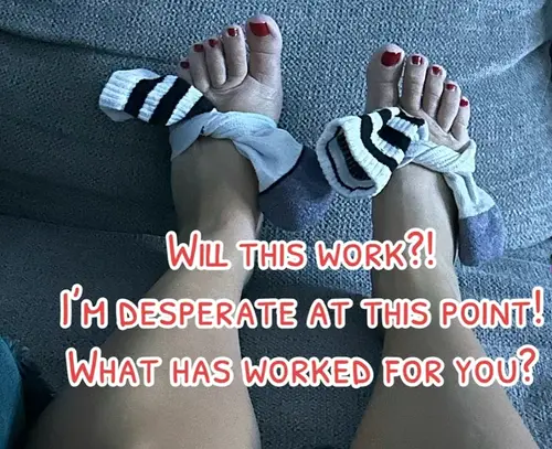 Ik douche, smeer mijn benen en voeten daarna in magnesium olie en laat het wat masseren/kneden door mijn partner. Doe elastieken over het midden van mijn voeten en dit lijkt te werken. Hoop dat je er iets aan hebt of aan een tip van een ander!
