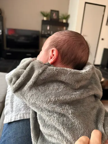 Wij houden hem vaak hoog met zijn hoofdje over onze schouder, dan traint hij ook zijn spieren waardoor hij steeds sterker wordt in zijn nekje.