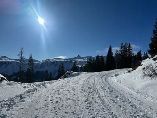 - Wandelen kan heel goed op een geprepareerde “winterwanderweg”, in Zwitserland / Oostenrijk zijn die aangegeven met roze bordjes en zie je ook op de pistemap. Dit zijn brede geprepareerde wandelpaden in de sneeuw met veel grip. Zie foto! Vaak komen deze wandelpaden ook uit bij restaurantjes waar de pistes ook uitkomen dus kan je ook meeten met mensen die dan gaan skiën!