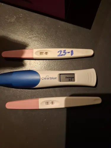 Streepjes test was trouwens vrijdag en zondag al erg donker. Ik zou eigenlijk zaterdag ongesteld moeten worden. zie foto (de clear blue en de onderzte zijn van zondag).