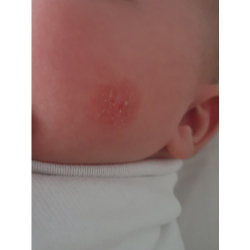 Mijn dochter heeft dit ook, op haar voorhoofd. Via de ap contact gehad met GGD en een foto gestuurd. Hier wordt geadviseerd het vet te houden met bijvoorbeeld kokosvet of lanettevaseline. Maar kan nu na een week nog niet zeggen dat het beter wordt.