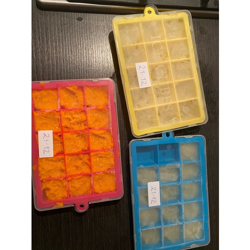 Ik vries de hapjes in in ijsklontbakjes van de ah want daar zit een deksel bij. Een tip van mama Roos 😏