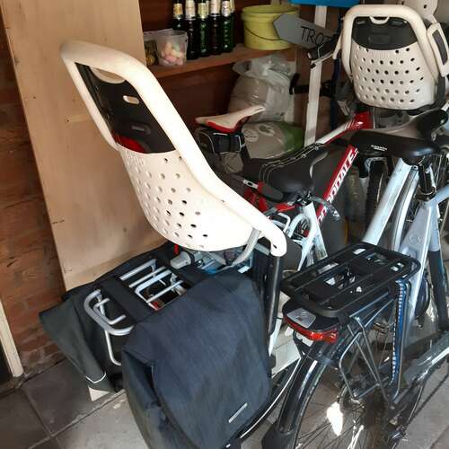 Ik heb helaas een elektrische fiets met accu op de bagage drager. Ik ga van de week kijken of het achter zitje ver genoeg naar achteren kan zodat ik een rugtas kan dragen. Voorop laat ik een grotere mand plaatsen en daar zal ik het mee moeten doen 😬