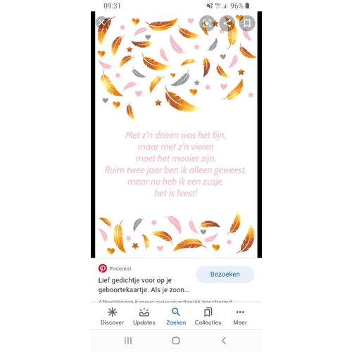 Niet echt een gedichtje, maar ik kwam toevallig laatst het oude geboortekaartje van mijn nichtje tegen (zij hebben ook 4 kinderen). Er stond een klavertje 4 op het kaartje en op de 3 blaadjes van het klavertje 4 stonden de namen van de oudere broers/zus en op het bovenste blaadje van het klavertje 4 stond de naam van het jongste nichtje. Eronder stond de tekst: Nu is ons geluk echt compleet. 馃崁
