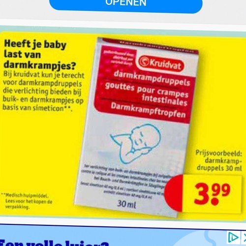 +1 Wij gebruikten eerst infacol, en dit leek best ok te werken. Toen had mijn man de kruidvat variant meegenomen, want idd veel goedkoper, en deze lijkt zelfs beter te werken. Alleen jammer dat het bij het filiaal bij ons in de buurt steeds uitverkocht is. :(