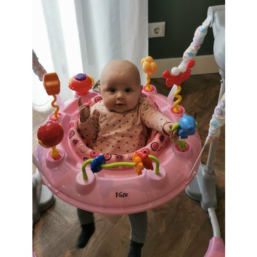 Nee, hier zitten geen wieltjes onder. Deze kun je op drie standen verstellen. De laagste stand kan de zelf de grond aanraken en zich afduwen om zo te wiebelen/schommelen. Ze mag er bij ons zo'n 5 a 10 minuten in. Zodat ze wel even iets anders heeft dan de box als ze er echt klaar mee is