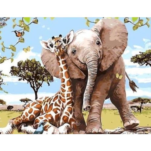 Wij laten deze muurschildering maken. Wel met alleen de olifant en giraffe. De omgeving er om heen niet